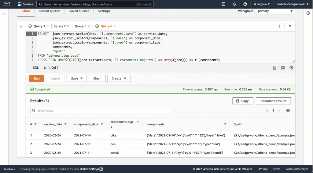 To get started with Athena you define your Glue table in the Athena UI and start writing SQL queries. For my project I’ve been working on heavily nested JSON. The schema for this data is very involved so I opted to just use JSON path and skip defining my schema in AWS Glue. Of course that was after I wasted two days trying to figure out how to do it.