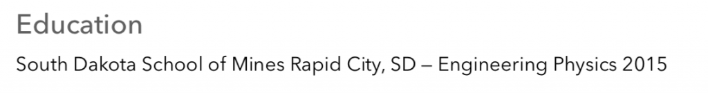My education line looks like what you see above. It includes the university I went to, what I majored in and the year I graduated. Since, I have a Minor in Computer Science it would be worthwhile to list it above. Do not list the classes you took unless you have nothing else to fill space. In general companies do not care what classes you took as long as your major was computer science, software engineering or something closely related. If you went to community college and then transferred to a university, you do not have to mention community college. Your education section should be very short. Five lines at the longest. It should be easy to skim past without thinking about. When the recruiter is skims your resume she should think “ah, the candidate has an appropriate college degree”. Experience The experience section is the most important part of your resume. It should be the largest and clearly visible in the top half of your resume. This section is where you convince the hiring manager to interview you. Many companies will post a general job posting for a ‘Software Engineer’, then depending on your experience and interview performance they will decide to make an offer for a particular level like Junior or Senior software engineer. I like to split the experience section up by job. Then have a small paragraph for each project at that job that I want to highlight. You want to fill the section with the highlights of your career. When did you demonstrate the most leadership, technical acumen and success? That is what you put in your experience section. Some of your experiences will have been bad. Projects fail, people get laid off, etc. A simple rule of thumb is “never volunteer negative information”. This goes double for your resume. Never include negative information in your resume. If your GPA is bad and you barely graduated college with a 1.5 GPA, do not put it in your resume. If you failed Calculus 2 three times do not put that in your resume. If you are a felon and do not have a legal obligation to disclose your criminal history, do not put it on your resume. If the company wants to know they will ask you. Were you fired from your last job? If so, do not put that on your resume. Employment Dates All you need to include is a range of months during which you worked at the job. Do not put January 13, 2017 through March 5, 2018 on your resume. The recruiter does not care how many days you were employed at a job. Put January 2017 - March 2018 as your employment date range. If the recruiter cares they will ask you about how many days you were employed during a phone screen. Do not say anything negative in your resume about any of your jobs. You might think a job was a horrible failure that you were glad to escape after a year. But your resume should describe that job as a successful stepping stone where you shipped desperately needed features to hungry customers.