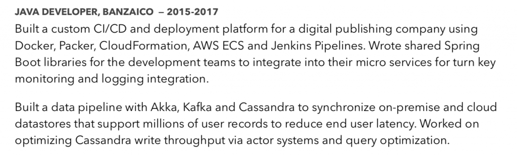 In this example I included two projects that I worked on while I had the title “Java Developer” at a company. You should include non-technical jobs Include as many jobs as you can fit into the Experience section. If you have one programming internship and three jobs where you worked as a dishwasher, list all of them. Add a short paragraph describing what you did and learned at your non-technical position. Wait until you have had four technical jobs before you remove non-technical roles from your resume. Skills The skills section is often highly positioned in engineers resumes. We value the technologies, languages and frameworks we have mastered and want to put them on top. Resist that urge. The tools you have developed skills with probably only overlap a little with the stack used at your next job. Put the skills section near the bottom of your resume. Do everything you can to make it as small as possible to free up space for the experience section. Hiring managers do not get a lot of value out a simple list of technologies you are familiar with. Unless you are a perfect match they will have to spend months training you on their technology stack. Unless you are a serious expert on a technology do not list a skill level. You are not ‘Advanced’ at Java or Object Oriented Design or anything else in your ‘Skills’ section. Companies are looking to fill positions for generalist software engineers and hire experts to solve particular problems. If you are an expert on a subject your resume should be focused only around your expertise in that one thing. A Cassandra database expert should not be looking for general purpose software engineering jobs, he should be focusing on jobs that want a Cassandra expert. As a Generalist you are expected to be able to muddle through any problem that is thrown at you. Companies will throw you at whatever they want no matter the ‘level’ of expertise you put on your resume. The hiring manager has better visibility into what the average skill level is than you do. You could list yourself as a ‘Kubernetes - Beginner’ and be the most knowledgable person that company ever interviewed. Only people who do dozens of interviews a year have the visibility necessary to compare you to the rest of the job market. Some people worry about being ‘grilled’ about anything they list in the skills section. So they try to protect themselves by putting ‘beginner’ or ‘intermediate’ next to the skill under the belief they will be grilled less. If you are a junior engineer, people know you are not an expert at anything. Becoming an expert requires a lot more effort and time than most junior engineers have invested into software engineering. Even if you put ‘Expert at distributed systems’, recruiters will see your two internships and they will not believe you. If you get asked about something admit what you do and do not know. If you are backed into a corner, just say “I know a little about that technology, and I am looking for jobs where I use it in my work.” If you are an expert in something you do not want to put it in your ‘Skills’ section, put it in the ‘Experience’ section! If you gave a talk on Kubernetes at Kubecon, that gives you enough expertise to interest people. Do not relegate an interesting experience like that to the skills section. If you were the Java performance expert at your last job then relate an experience where you saved the company hundreds of thousands of dollars in hardware costs. Don’t list actual expertise, tell a story about it. Aim to list twenty skills at most. You want to be able to talk about them all intelligently. More skills is not necessarily better, the recruiters is looking for a few keywords that match the job posting. Your goal for the skills section is to give the recruiter the keywords they are looking for and to hint at the breadth of your skills. Goal Statement (Optional) The goal statement is a short paragraph that you can use to help the hiring manager understand what you are looking for. It can be helpful when applying to companies that make general job posts for ‘Software Engineers’ and then rank candidates based on experience. Use the goal statement to let them know what role and grade you are looking for. “Senior Software Engineer building today’s software products and platforms, training developers to maximize their abilities, and supporting business success.“ The line above is one I have used. It gives an idea of what role I am looking for and how I view my role in a company. The goal statement is optional, you do not need one. If you are short on space cut it and devote more to the experience section. What about Personal Projects? Personal projects are not one of the major sections on your resume. I include links to my github and blog where people can find my personal projects. I would prioritize describing personal projects before hobbies, but describing job experience is just better. If you have a bunch of personal projects and only one job or internship, make sure to use more space describing that job than you do on your personal projects. Style Styling a resume is a worthwhile, but risky process. Unless you are looking or jobs as a designer or creative artist, showcasing your artistic talent is not going to contribute to getting a job. Hiring managers and recruiters are skimming through dozens of resumes at a time. Your first priority is to make sure that the important sections are easy to find on your resume. Use bold headings that make it obvious that this section is about your education and that section is about your work experience. You can add flair to your resume to help standout. Try to avoid anything fancy, a resume is not art. Any flair should be evaluated on whether it makes your resume more difficult to read. Unless you are 100% sure your flair does not make your resume harder to read cut it. Sentences with Trailing words Watch out for sentences with trailing 
