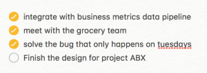 Daily standups are a standard part of the software engineering life. Over the last four years I have had a standup of some kind nearly every workday. Standup is a ritual, you circle up with your coworkers and take turns trying to remember what exactly you did to justify your salary yesterday. Every third update devolves into a 5+ minute derailment of the meeting that would really prefer not to follow. Then when it is finally your turn you spill out your update as quickly as possible. Only to slowly realize 3 minutes later that you forgot to mention half of the things you did the previous day. The solution to standup is pretty simple. Just take notes. I keep a checklist of tasks in the Mac notes app. I check off the item when its done. Then in standup all I do is read through my list.