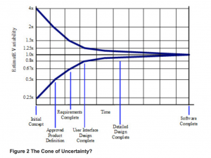 I have been reading ‘Software Estimation’ by Steve McConnell which is about estimating software projects. I got interested in the subject a few months ago, because my interns were asking questions about how to estimate stories in Agile ceremonies. The company I work at does not have any estimating theory. Its a shoot from the hip, ‘wild ass guess’ environment. I didn’t really have a good answer for the interns. A couple surprises are that research has shown software engineers typically underestimate tasks to the tune of about 30% of the actual time and that the range of estimation accuracy is around 1.2-16x. [caption id=“attachment_92” align=“alignnone” width=“300”]