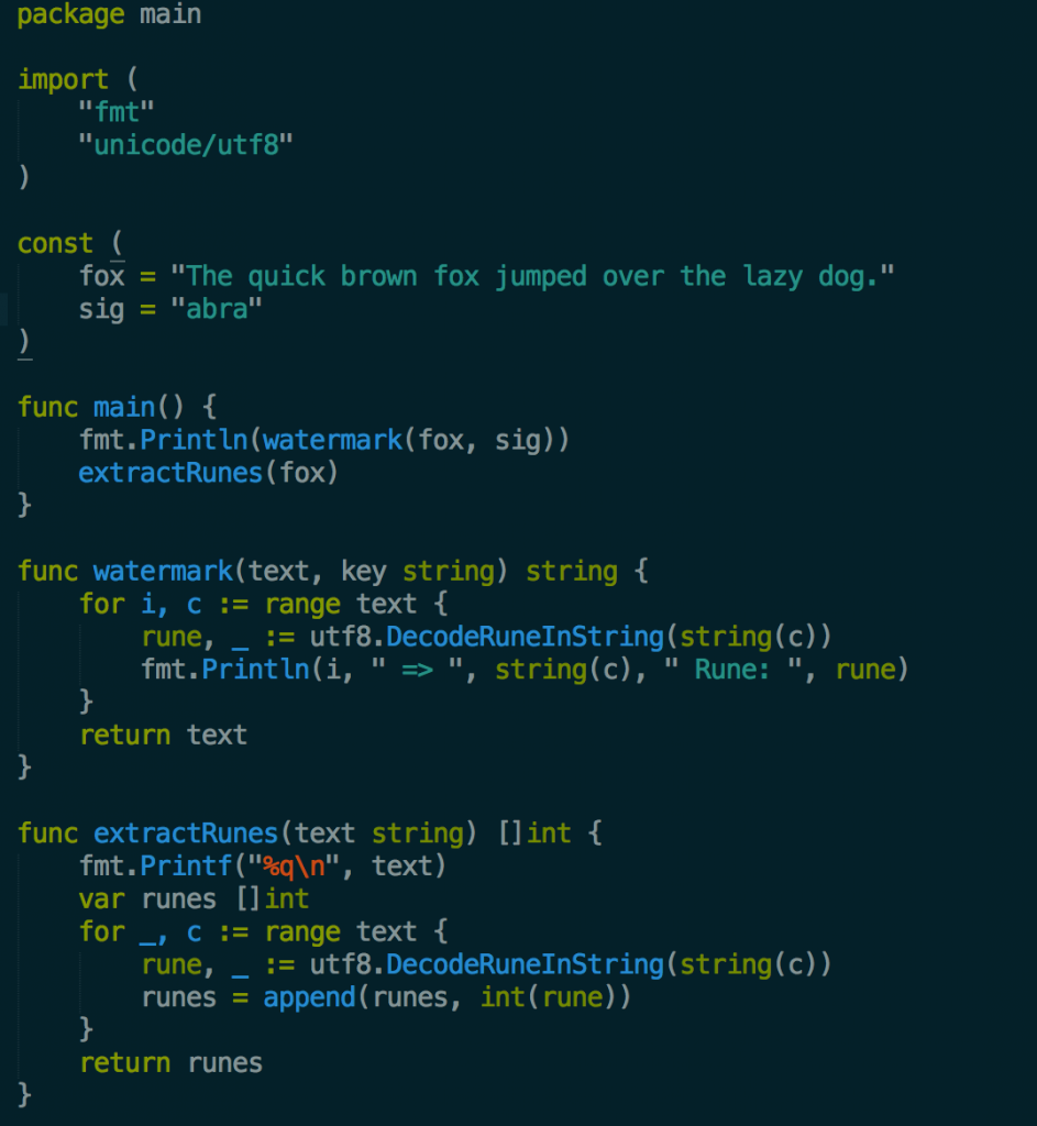 Above is my program so far. It is a short program with a bit of exploratory code that converts strings into their unicode rune ids. Back when I mainly used Java, I would have had to setup an IDE, integrated maven and think about package structure. In Go I just have a main.go file, if I need dependencies I create a /vendor directory and usego get github.com/gin-gonic/gin to pull the dependency. Overall the lightweightness of the Go tooling makes it very easy to build small programs.
